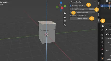 Found under the Edit N-panel, Vertex Overlap is a Blender add-on that alerts you to overlapping vertices in real-time and allows you to merge them with a single click.