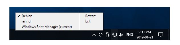 bootnext allows for the setting of the next EFI BootNext option directly from the systray.bootnext is a very straightforward app that will give you the options for seamlessly booting into your preferred OS after restarting your machine. All available OS are presented via a right-click on the app’s systray icon.