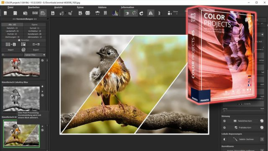 For pictures that get stuck – COLOR projects 6 professional brings out the best in their pictures – all with intelligent tools in an efficient, crystal-clear workflow. You want to develop pictures that stay as fast and stress-free as possible? COLOR projects 7 professional does this work reliably for you. You do not need to operate a single switch, to adjust any controls or to try out any functions. At the core of COLOR projects 7 professional are the integrated picture suggestions. Within seconds, COLOR projects 7 professional analyzes your images and calculates 208 image suggestions – all facets of modern photography and many retro styles are included here.
