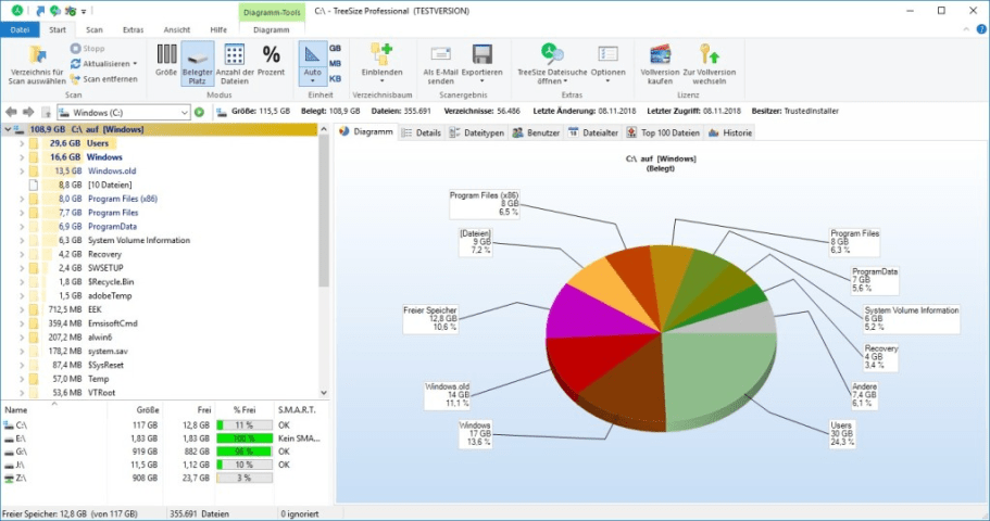 TreeSize Professional is a powerful and flexible hard disk space manager for all windows. Find out which folders are the largest on your drives and recover megabytes on your disks. TreeSize Professional shows you the size, allocated and wasted space, the number of files, 3D charts, the last access date, the file owner and permissions, the NTFS compression rate and much more information for several folders or drives you choose. It also lets you search drives, entire servers or the entire network for old, big, temporary and duplicate files. The search results can be moved, deleted or exported.