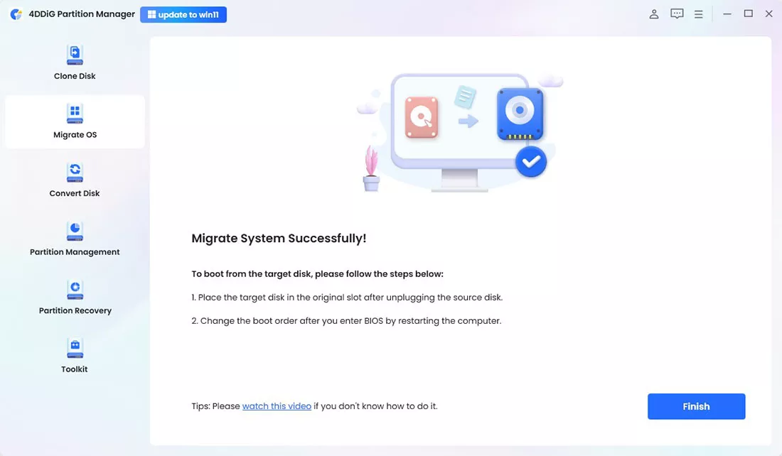 - One-click OS Migration Wizard for Windows 10 & 11: Quick System & Data Transfer Solution. 4DDiG Partition Manager can migrate system and large files or folders from one disk partition to a larger one in one click.